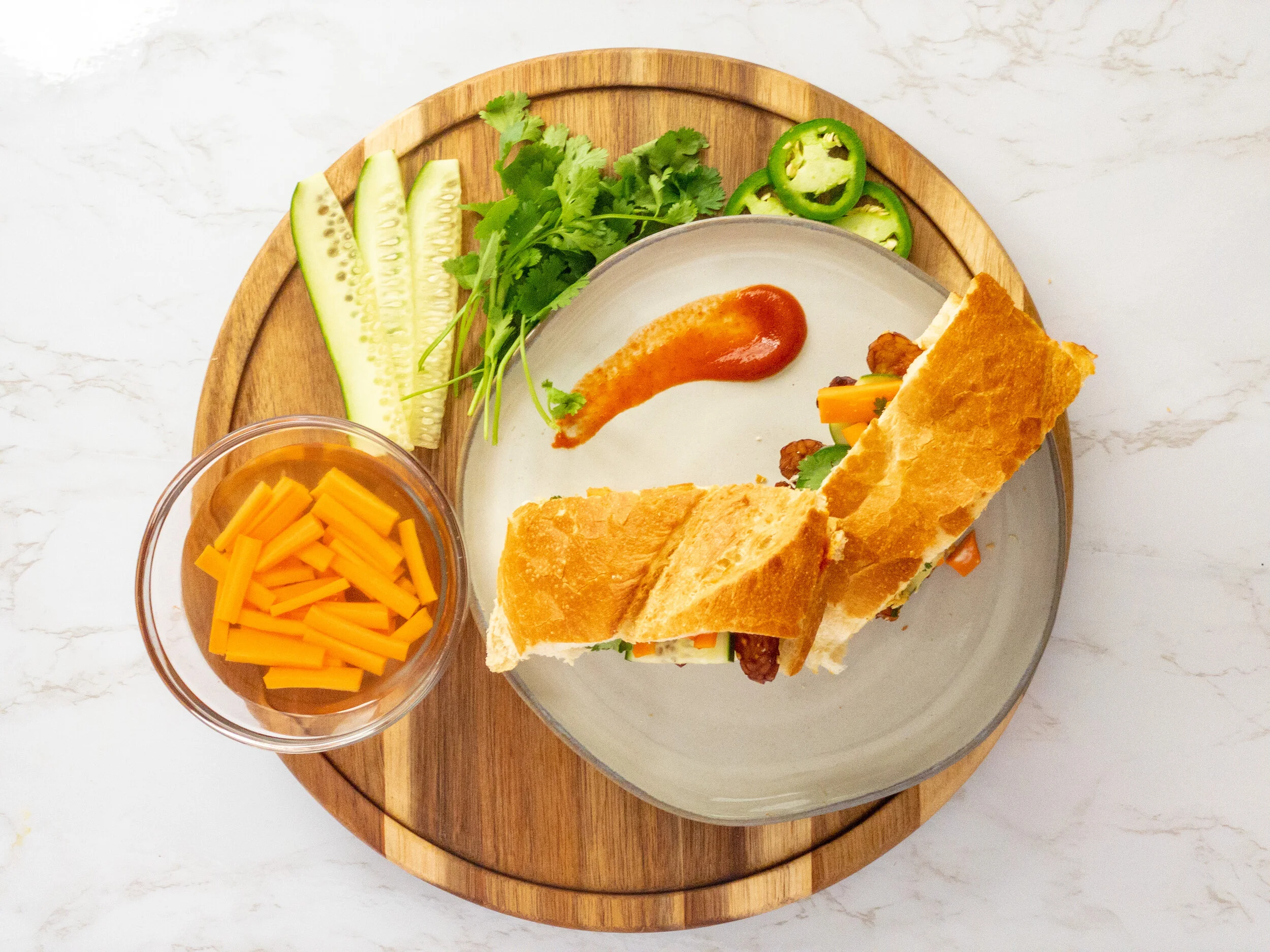 - Lay tempeh slices on one side of loaf, followed by a layer of cucumber, pickled carrots, and cilantro